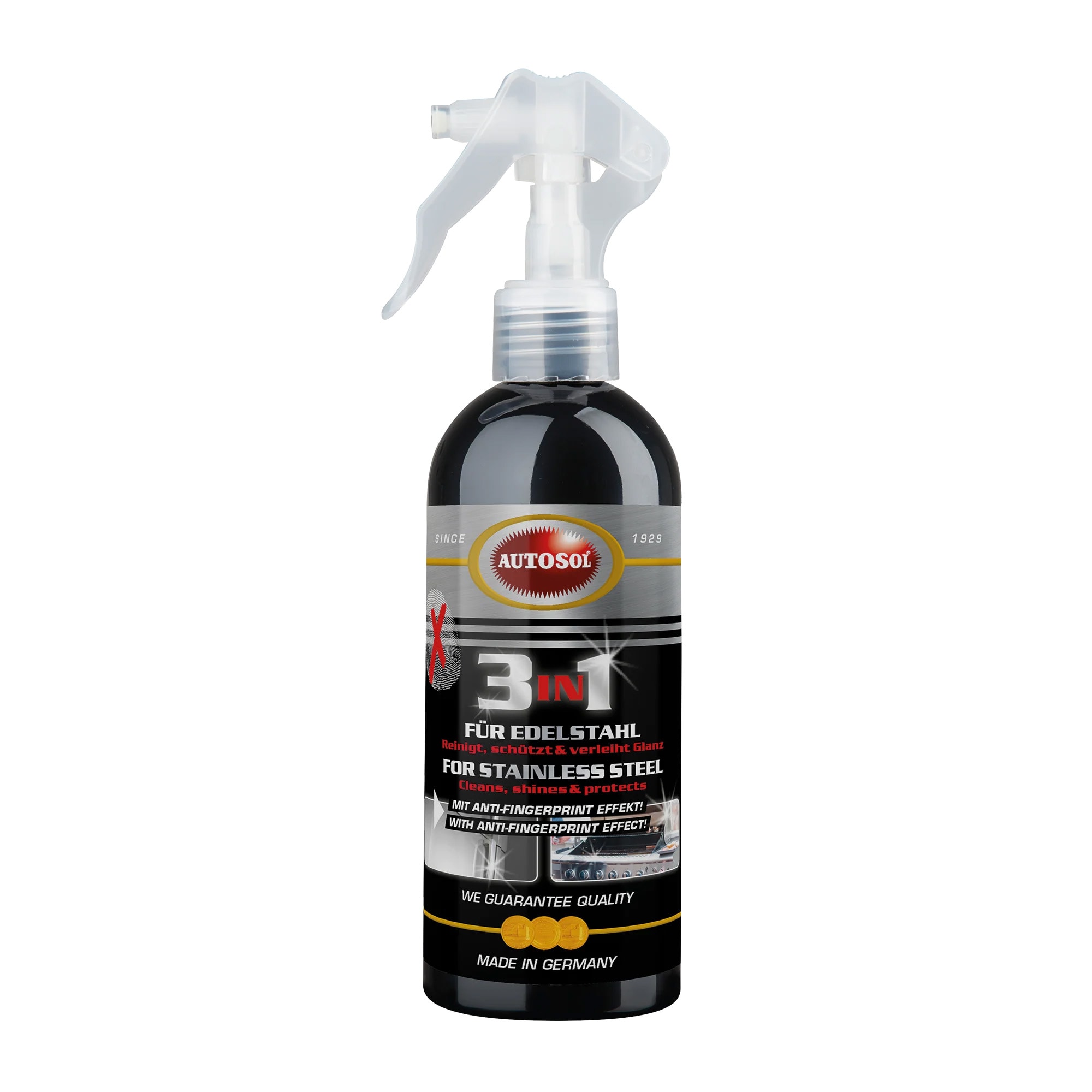 AUTOSOL® 3in1 FÜR EDELSTAHL mit Anti-Fingerprint Effekt! Speziell entwickelt, um Edelstahloberflächen in nur einem einfachen Schritt zu reinigen, zu schützen und streifenfreien Glanz zu verleihen. Entfernt mühelos sämtliche Verschmutzungen wie Öl, Fett, Fingerabdrücke u. Ä. Lässt Ihre Geräte wieder wie neu aussehen. Ideal für gebürstete Metalloberflächen und eloxiertes Aluminium.