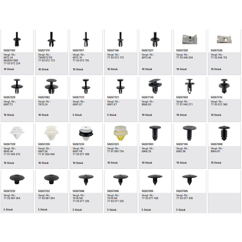 - Für viele Bereiche am Fahrzeug gibt es verschiedene Clips, die die Verbindung zwischen Karosserie und Verkleidung sichern, zum Beispiel bei Verkleidungen im Kofferraum, im Fahrzeuginnenraum wie die Türverkleidung, im Motorraum, Klammern für Seitenleisten usw.