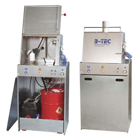 Reinigungsstation zum manuellen und automatischen Reinigen von Spritzpistolen. Gerät für einen Anwender. Robuste Edelstahlausführung im Reinigungsbereich. Zum Einsatz für Lösemittel oder Wasser. Inklusive Absaugung.