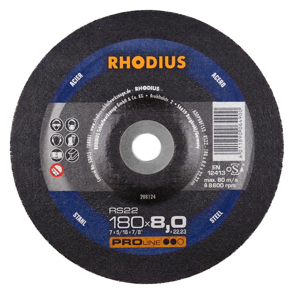 Die Schruppscheibe RS22 hat eine Scheibenbreite von 8,0 mm und ist in den Durchmessern von 180 mm und 230 mm erhältlich.