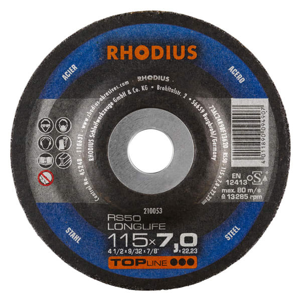 Die RHODIUS RS50 LONGLIFE wurde gezielt für die Bearbeitung von Stahl (Schwarzstahl auch Baustahl, St37, S235JR, 1.0037 oder Karbonstahl genannt) und Stahlguss entwickelt. Die Schruppscheibe RS50 LONGLIFE eignet sich hervorragend für das Anfasen, für die Schweissnahtvorbereitung, für das Egalisieren von Schweissnähten, um Gussteile zu verputzen bzw. zu egalisieren sowie um Kanten zu brechen und zum Entgraten. Sie ist darüber hinaus auch für den Flächenschliff geeignet.