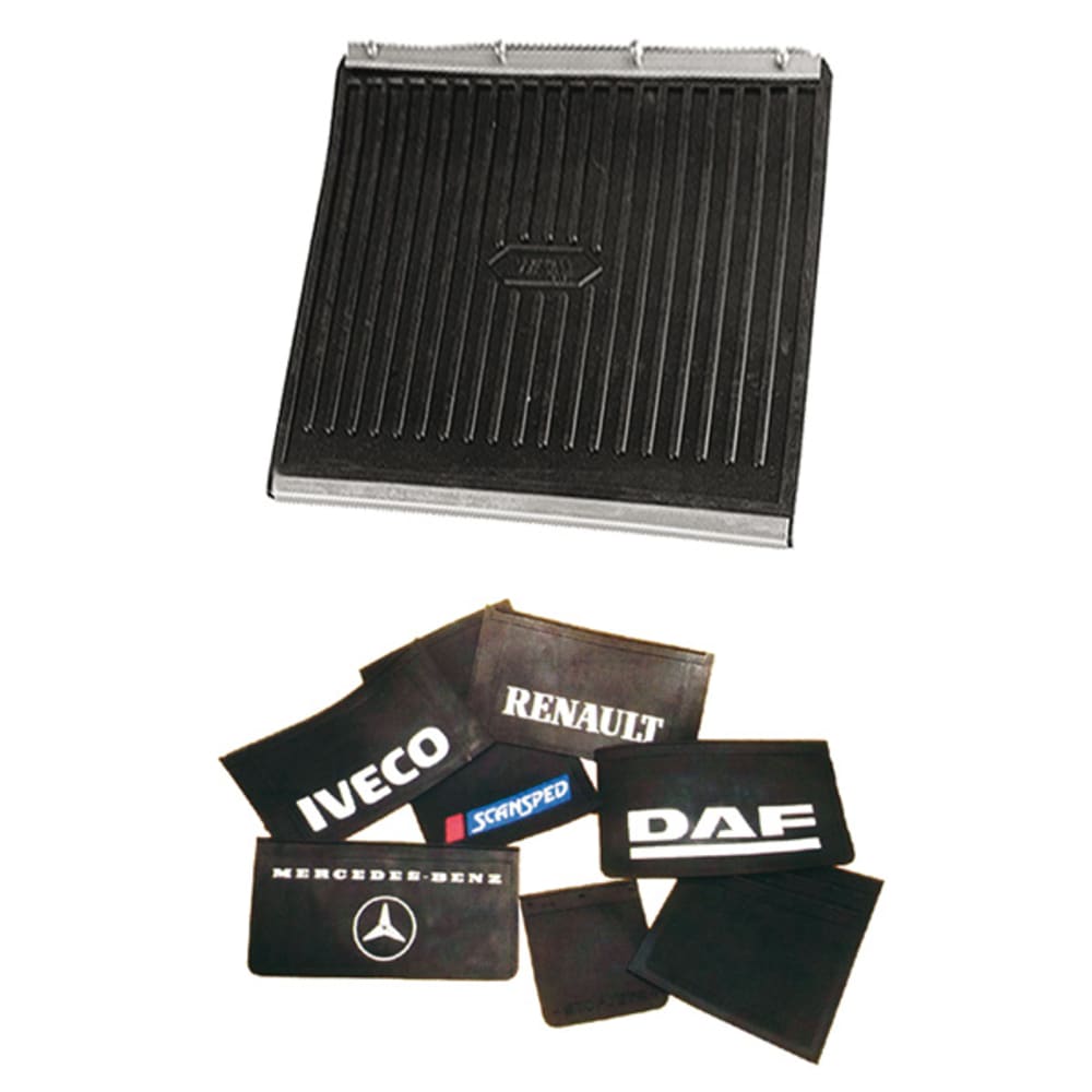 En caoutchouc noir, neutre, raide et résistant. Avec rail et renfort latéral en alu.