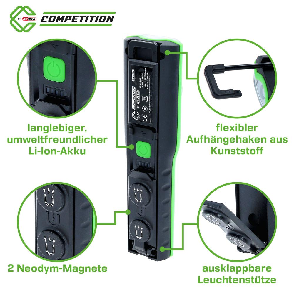 - 2 modes d’éclairage : lampe frontale COB et spot LED SMD