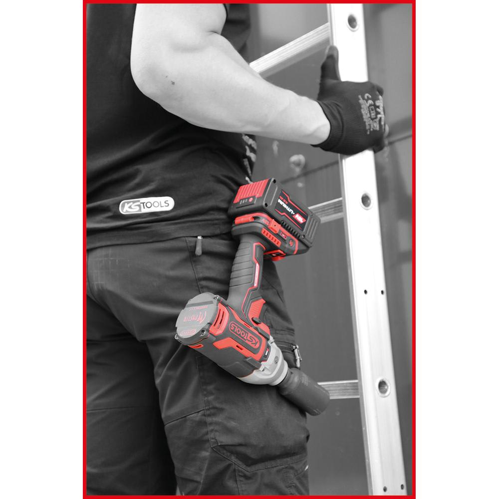 Le moteur sans balais de la visseuse à percussion sans fil allonge considérablement l’autonomie par charge, entraînant une diminution des temps d’arrêt et un allongement significatif de la durée de vie de l’appareil. L’éclairage LED intégré garantit un éclairage optimal de la zone de travail, tandis que la commande variable de la vitesse de rotation offre la garantie de travaux précis. Le carré d’entraînement 1/2" est réalisé selon la norme DIN 3120 / ISO 1174 et assure une liaison parfaitement fiable.