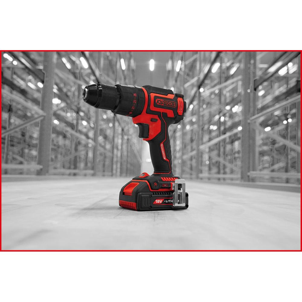 Le moteur sans balais de la perceuse-visseuse à percussion sans fil allonge considérablement l’autonomie par charge, entraînant une diminution des temps d’arrêt et un allongement significatif de la durée de vie de l’appareil. L’éclairage LED intégré garantit un éclairage optimal de la zone de travail, tandis que la commande variable de la vitesse de rotation offre la garantie de travaux précis. Le mandrin à serrage rapide Röhm en métal de 13 mm haute qualité de la perceuse-visseuse à percussion sans fil offre un porte-outil fiable et rapide.