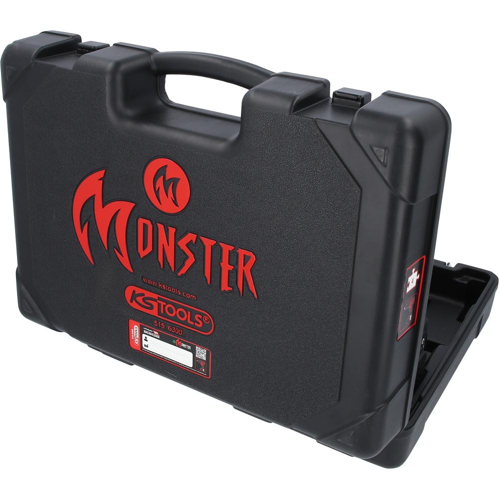 Il est livré dans un coffret en plastique robuste pour un rangement sûr. Ce coffret est muni de charnières et de boucles en acier inoxydable garantissant une longue durabilité. Il comporte également une zone d’inscription vierge dans laquelle l’utilisateur peut ajouter l’inscription de son choix, ou même des pictogrammes, pour faciliter l’identification du contenu. Le coffret comprend également un emplacement vide pour une batterie supplémentaire, un emplacement pour le jeu d’embouts eMONSTER adéquat et un compartiment pour petites pièces intégré permettant un stockage approprié des petits accessoires.