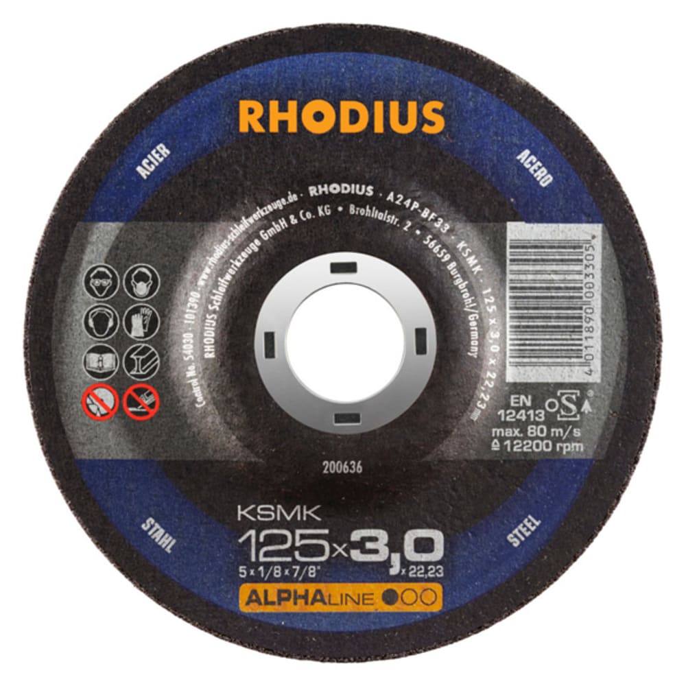 Ce disque de tronçonnage contient du corindon de qualité (oxyde d’aluminium) et deux couches de tissu en fibres de verre. Conformément à la norme EN 12413 et aux exigences de l’oSA, la charge latérale minimale pour le disque de tronçonnage s'élève à 40 N, voire 50 N pour les diamètres supérieurs à 150 mm. La date limite d’utilisation (trois ans) est indiquée sur la bague percée. Des contrôles intensifs réalisés tout au long du processus de production permettent de garantir une qualité constante. Tous les mille disques, un disque est par ailleurs soumis à un test destructif afin d’offrir une sécurité maximale. Il s’agit ici d'un disque à moyeu déporté (forme 42). Ce disque de tronçonnage reste particulièrement stable pendant les coupes.
