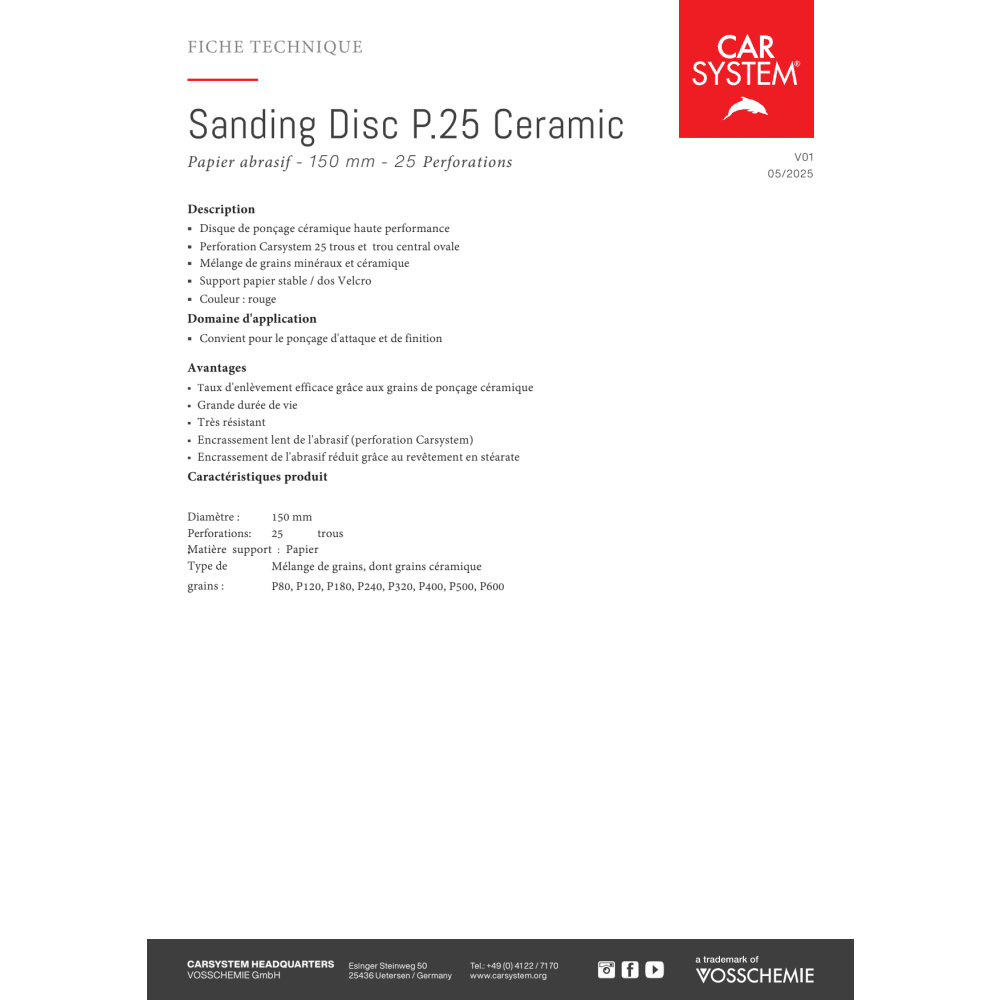 Le Sanding Disc P.25 Ceramic est un disque abrasif céramique haute performance, conçu avec la perforation Carsystem de 25 trous et une perforation centrale ovale. Les grains abrasifs céramiques assurent un taux d’enlèvement matière efficace et le rendent très résistant. La perforation spéciale et le revêtement en stéarate évitent un encrassement rapide de l’abrasif – idéal pour un ponçage d’attaque et de finition. Le support papier stable auto-agrippant garantit un maintien sûr sur le plateau de ponçage.