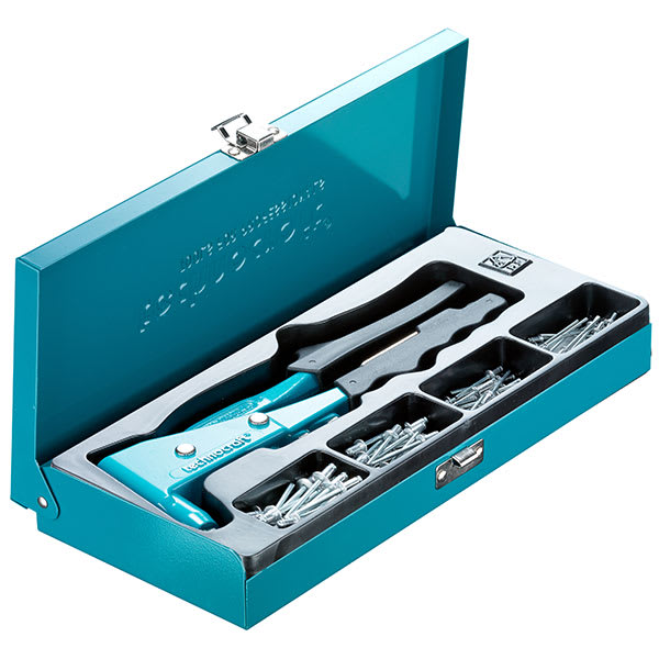 Exécution industrielle, fonte aluminium moulée sous pression, vernie vert, levier supérieur et fourreau acier CV, dureté des mors 57°-59° HRC, fourreau 40°-45° HRC, branches ergonomiques, pour rivets 2.4 / 3.2 / 4.0 / 4.8 mm, 80 rivets assortis et 20 rondelles asssorties, boîte métallique verte