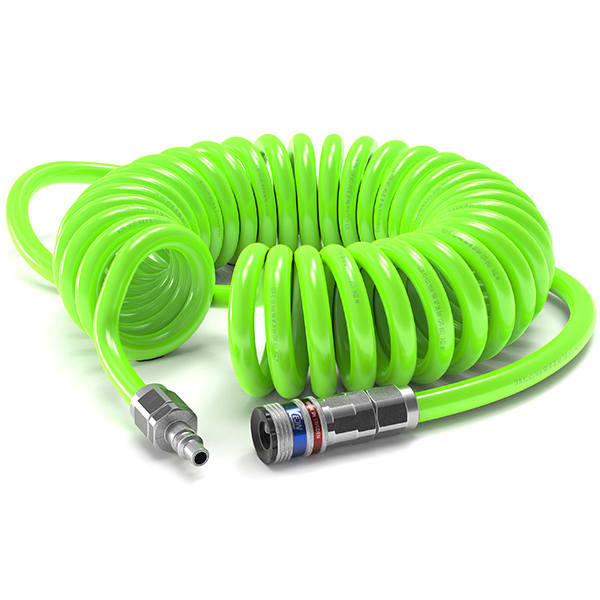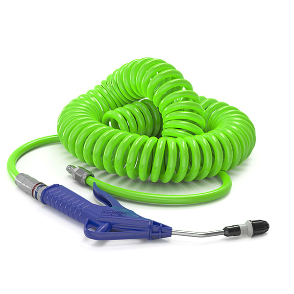 Kit de tuyau spiralé de sécurité Hi -Visibility (haute visibilité), prêt à l'emploi avec coupleur et embout de sécurité CEJN eSafe et soufflette de sécurité.